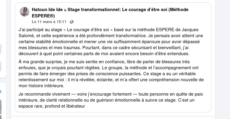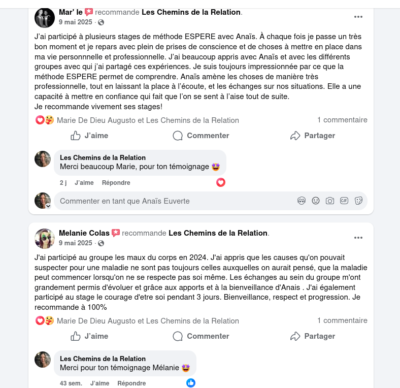 « J’ai apprécié le stage » Le courage d’être soi » qui m’a beaucoup apporté sur le plan relationnel. Communiquer avec les autres n’est pas toujours simple et les conseils d’Anaïs m’ont fait progresser. »